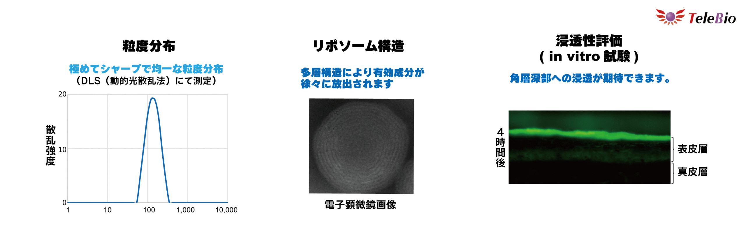 - 極めて高い均一性 (PDI 0.15)を持つリポソーム シャープで均一な粒度分布(動的光散乱法(DLS)測定)を最新のリポソーム化技術により実現。安定した品質、処方適合性、効果の再現性に貢献します。PDI(多分散指数)